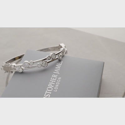 A refined sterling silver bangle featuring an alternating Duo-Solo pattern of round CZ stones, accented with polished silver segments for a balanced, elegant design. Perfect for layering or wearing alone as a statement piece.